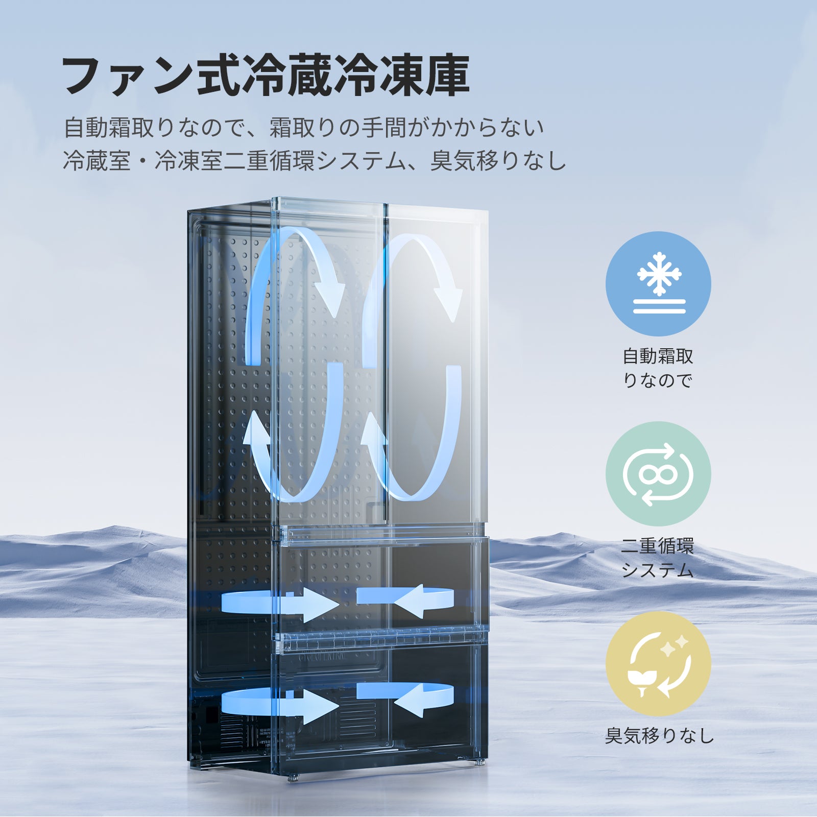 【手間いらずの自動霜取り&清潔保冷】面倒な霜取り作業は一切不要の「自動霜取り」機能搭載。さらに、冷蔵室と冷凍室で冷却空気を循環させる「二重循環システム」により、嫌な臭いの移り混じりを防ぎ、食材ごとに清潔な状態で鮮度を長く保ちます。