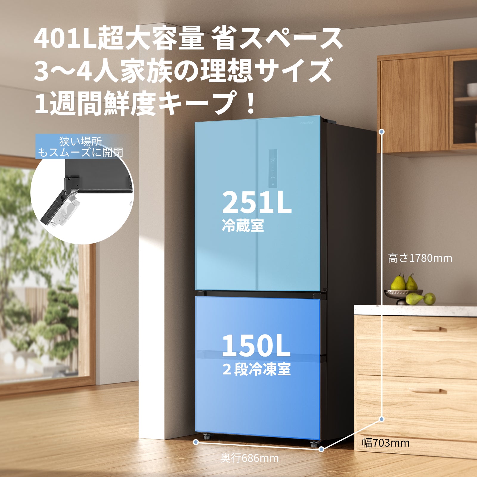 【401L超大容量で省スペース】この大容量冷蔵庫は、設置幅が70.3cmとコンパクト冷蔵庫並みの省スペース設計でありながら、総容量401L(冷蔵251L+冷凍150L)を実現した大型冷蔵庫です。3〜4人家族のまとめ買いも楽々収納。高さ178cmのすらりとしたスタイリッシュデザインが、空間を圧迫しません。