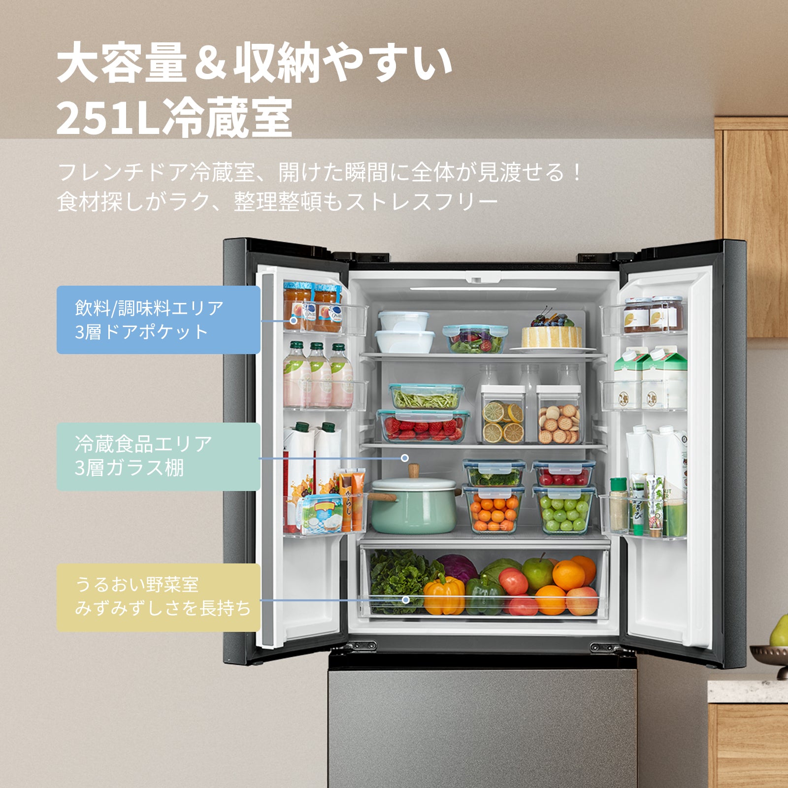 【251L冷蔵室は収納力抜群&見渡しやすい】冷蔵室は251Lの大容量。フレンチドアを開ければ、庫内全体が一望でき、探している食材がすぐに見つかります。食品整理のストレスから解放されます。3段のガラス棚、専用の野菜室、ドアの3段ポケット(飲料・調味料用)で、食材の種類に合わせてきちんと分類収納可能です。