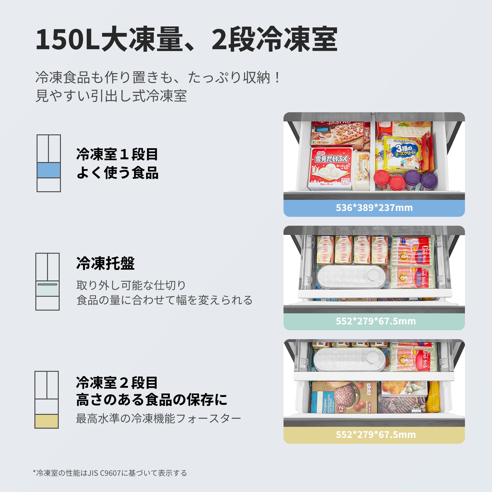 【150Lの大冷凍室と自在収納】合計150Lとたっぷり広い2段式の引き出し型冷凍室。よく使う冷凍食品は上段で、かさ高い食材や作り置きは下段のスライドケースで、と用途に合わせて収納できます。上段は仕切り板で区切りも自由自在。製氷皿も付属します。