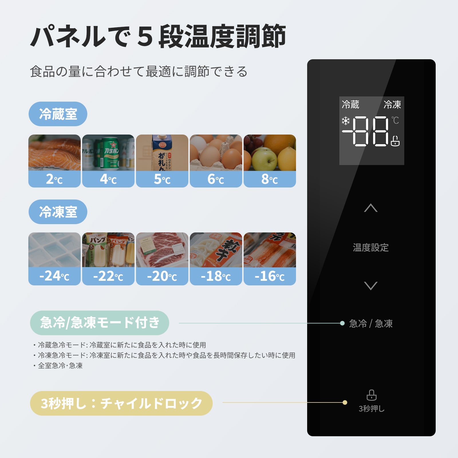 【5段階温度調節と便利機能】庫内の操作パネルで、冷蔵室(2℃〜8℃)と冷凍室(-24℃〜-16℃)の温度をそれぞれ5段階で細かく調節可能。「急冷」「急凍」モードで素早く冷却します。誤操作防止のチャイルドロック機能も標準装備で、ご家族皆様に安心してお使いいただけます。