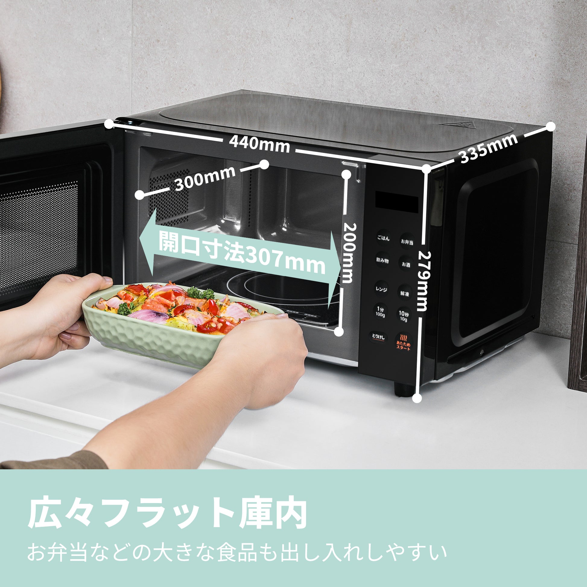 · 16L広々庫内】横30cmの庫内スペースを備え、大きなサイズのお弁当や冷凍ピザも簡単にあたためます。
